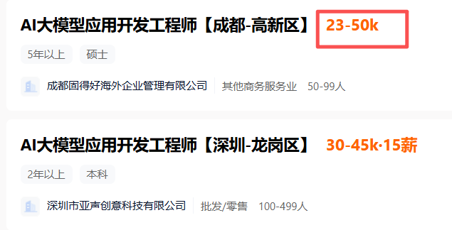 需求量的增大,使得各企业以高薪来吸引人才,据猎聘最新再招岗位显示,大模型应用开发岗位的最高年薪可达60w。