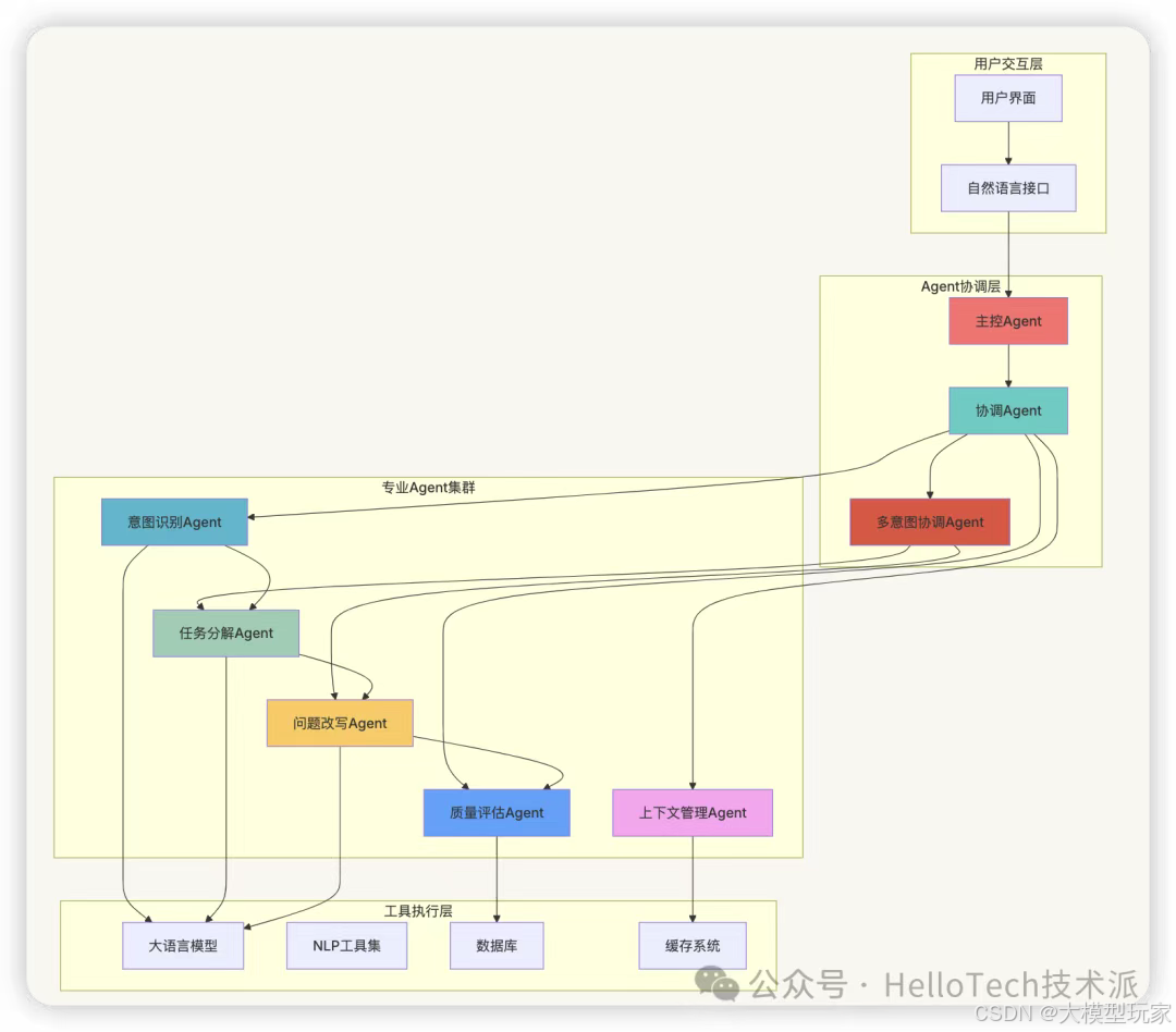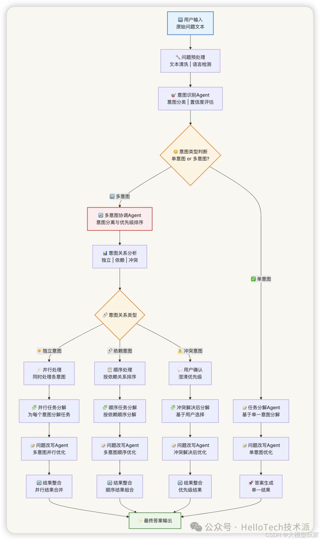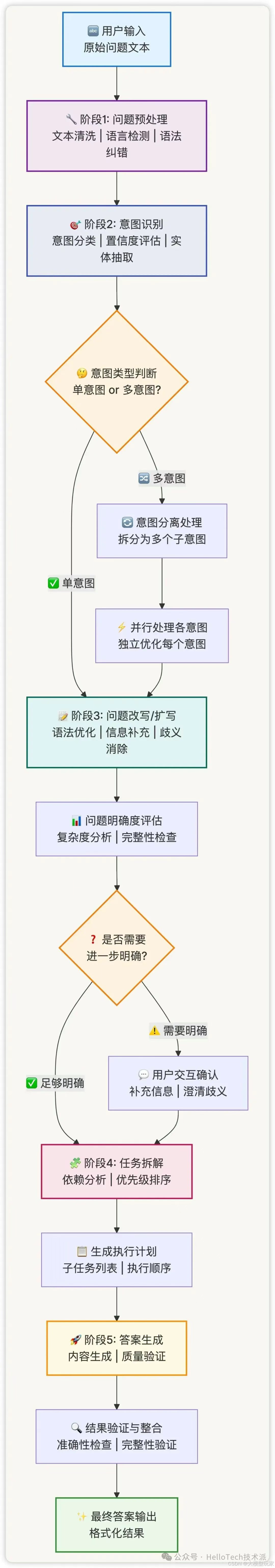 用户输入 → 问题预处理 → 意图识别 → 任务拆解 → 问题改写/扩写 → 答案生成与验证 → 最终输出