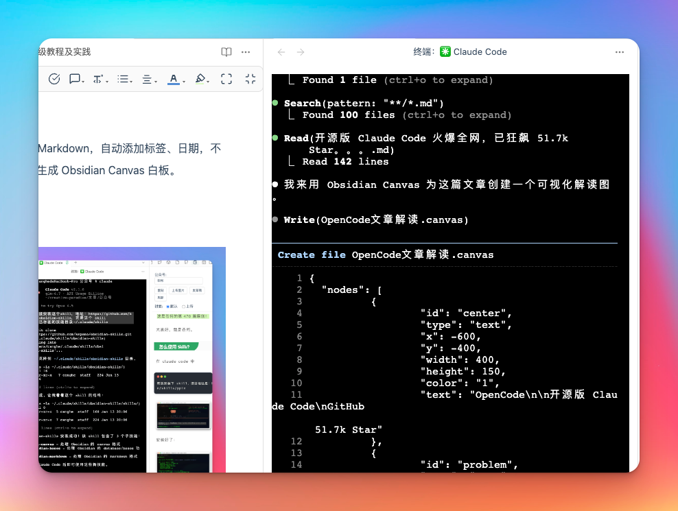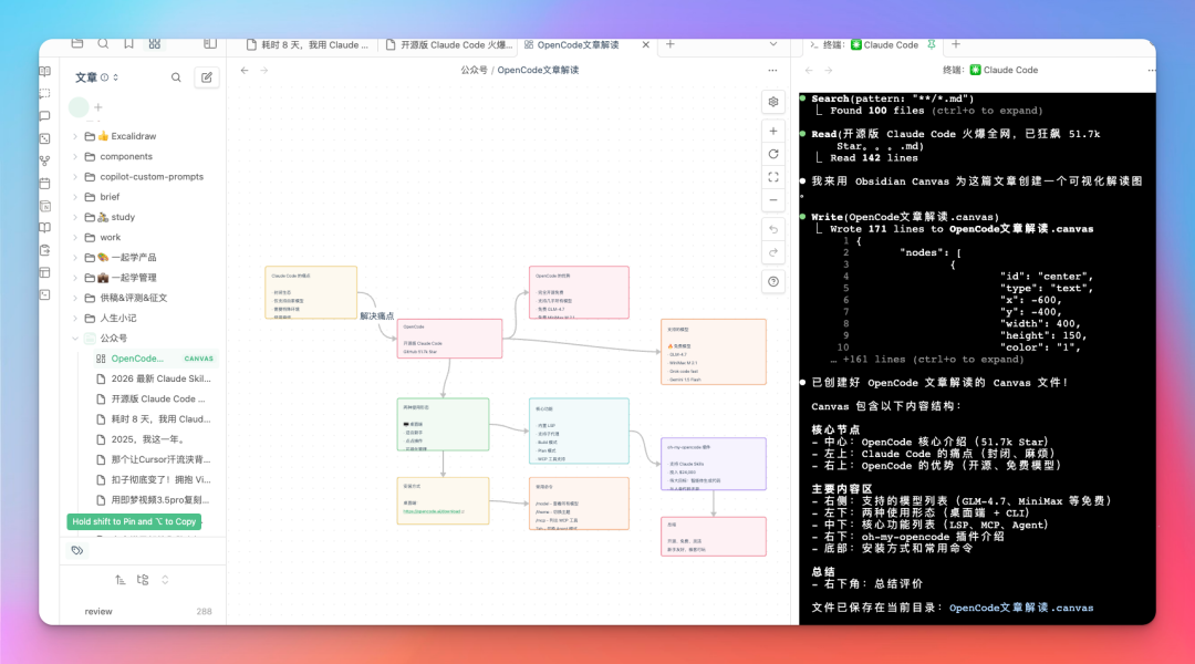 用obsidian-skills画一个 canvas 来解读这一篇文章"开源版 Claude Code 火爆全网,已狂飙 51.7k Star。。。"