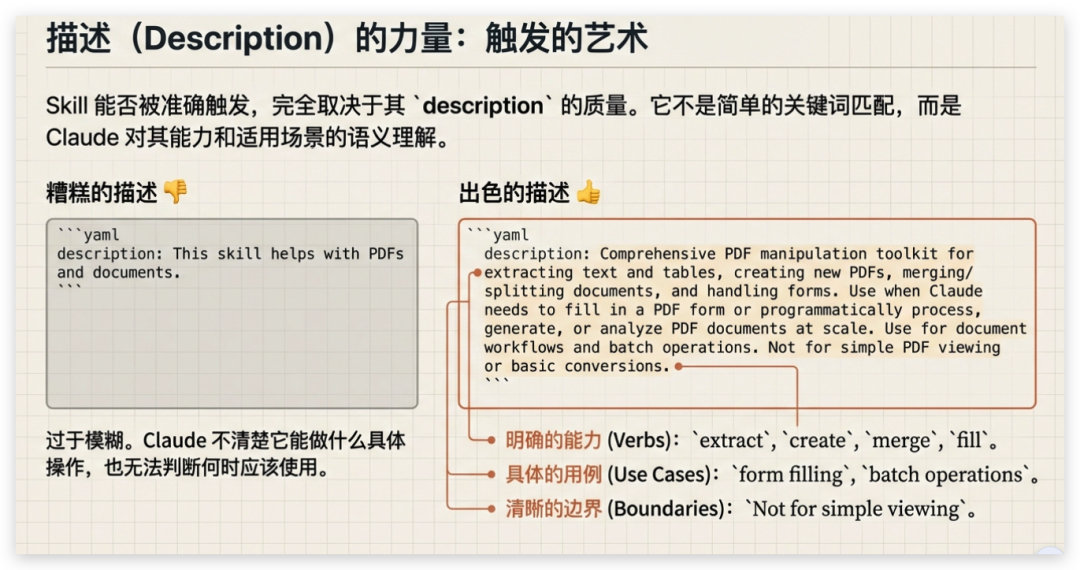 Skill 能否被准确触发,完全取决于其SKILL. md 中 description 的质量。它非简单的关键词匹配,而是 Claude 对其能力和适用场景的语义理解。