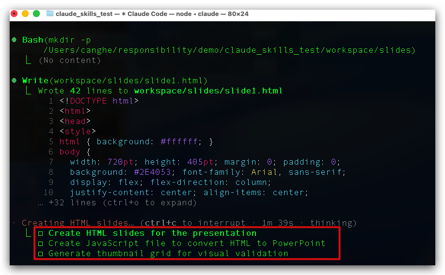 可以看到先是去用 HTML 来写 PPT,然后调用 pptx skill 里面的 html2pptx.md 约束,把 html 转为 PPT。