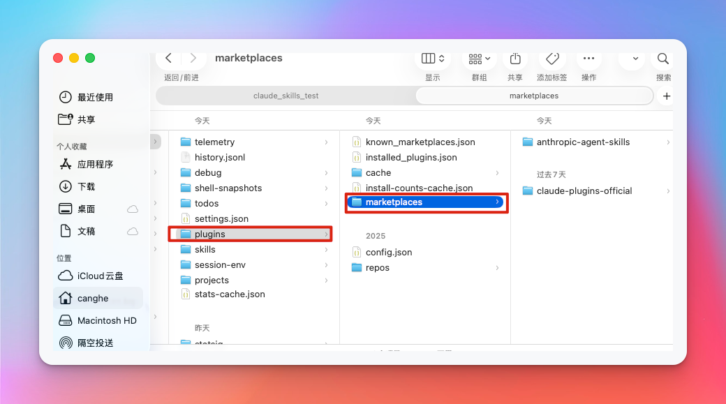 通过插件安装的 skills 需要在 .claude/plugins/marketplaces/ 这个目录下查看: