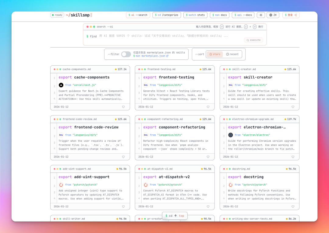 也可以在 Skills 市场找到非常多的 skill:https://skillsmp.com/zh
