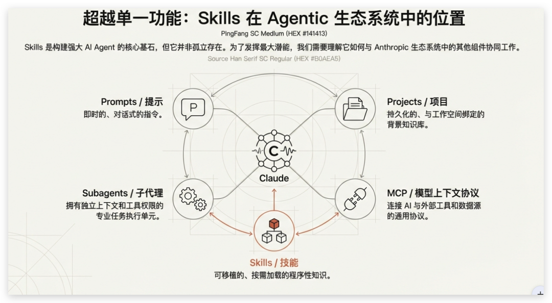 Skills 是构建强大 Al Agent 的核心基石,但它并非孤立存在。为了发挥最大潜能,我们需要理解它如何与 Anthropic 生态系统中的其他组件协同工作。