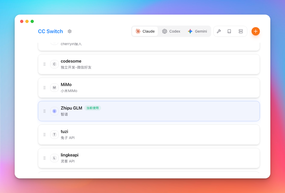 通常我还会安装一个工具叫 CC Swtich,用来管理各种 API 的配置。