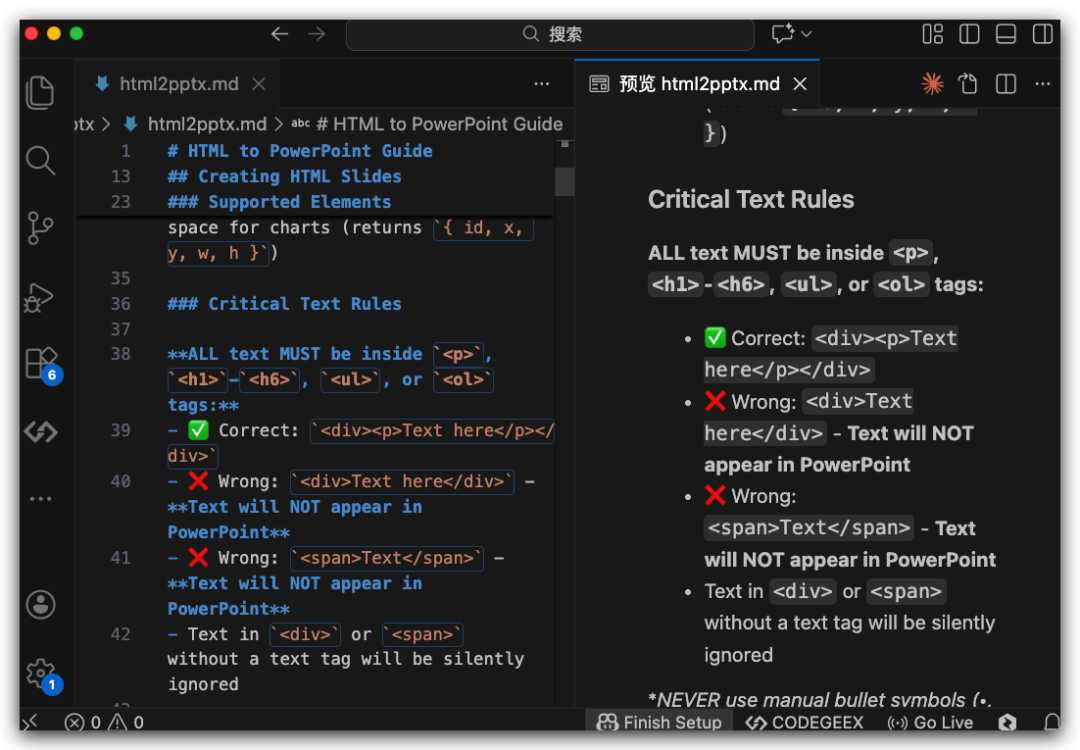 而这个约束文件 html2pptx.md 是对 html 转 PPT 的一些约束规则和条件,通过 markdown 的形式约束了。