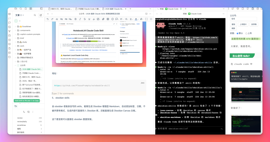 由 obsidian 老板亲自写的 skills,能够生成 Obsidian 增强型 Markdown,自动添加标签、日期,不破坏原有格式,生成内容可直接存入 Obsidian 库。还能直接生成 Obsidian Canvas 白板。
