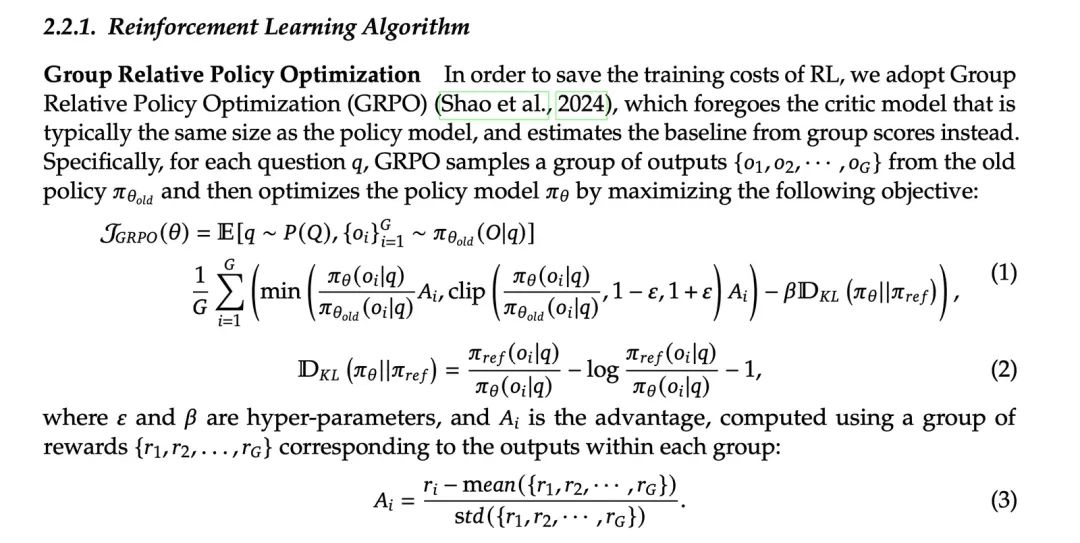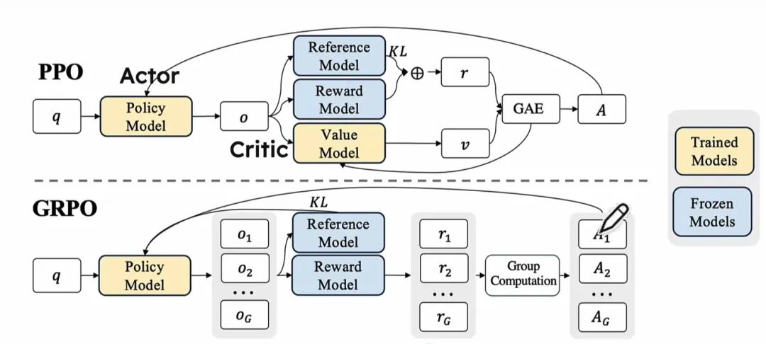 - 与PPO相比,无需额外训练价值模型,通过从同一问题的多个输出中计算平均奖励来替代价值函数的作用,从而减少了显存和计算负担,但依赖于奖励模型的评分来区分输出的好坏,这对于奖励模型的设计也提出了更高的要求。
