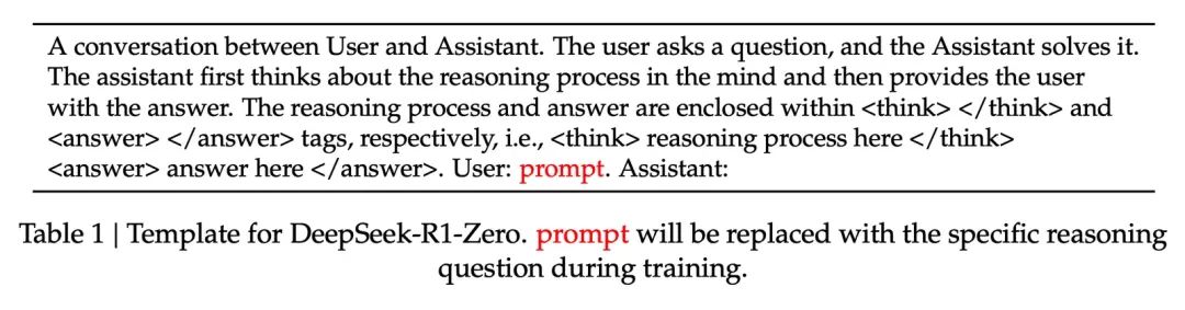 - deepseek-R1 强化学习训练时使用的prompt格式,要求模型将推理的过程的思路输出到标签中,引导模型进行慢思考;
