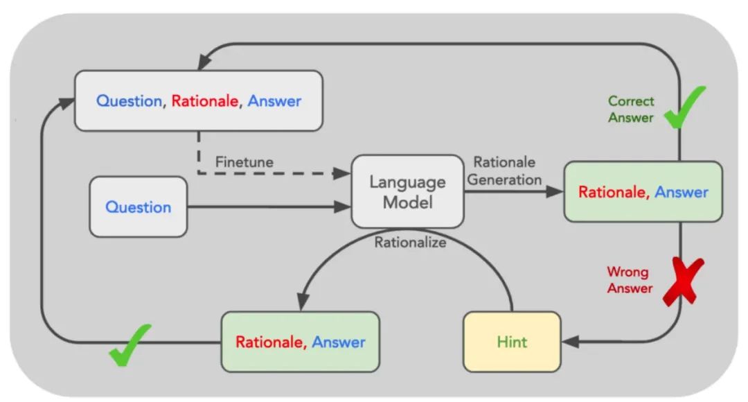 - STaR 的核心思路是利用 LLM 已有的推理能力,迭代式的引导模型产生合理推理过程 (Rationales) 的能力,井将 Rationales 融入到训练过程内,让模型学会进行推理;