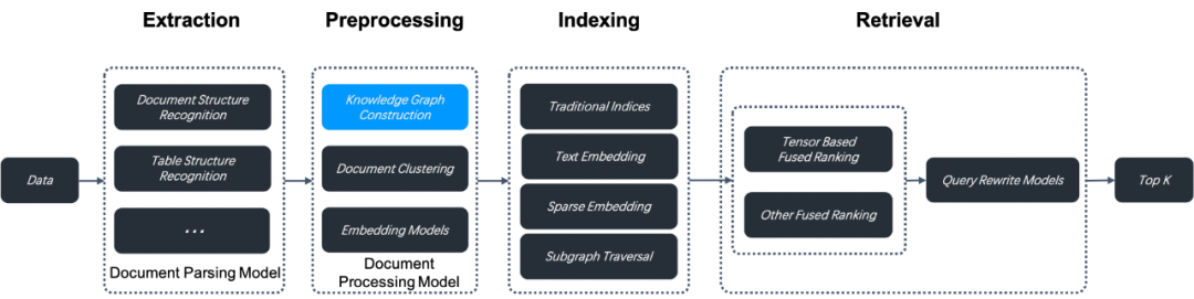 RAGFlow在数据提取和索引之间添加了知识图谱构建步骤,如下所示。此步骤会根据您指定的分块方法生成的现有块,创建额外的块。