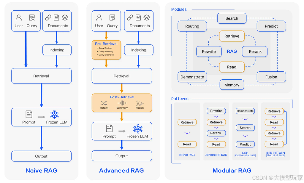 根据专家对RAG领域的研究表明,RAG有三个重要的发展阶段:简单RAG、高级RAG和模块化RAG,在高级RAG应用阶段,在简单RAG基础上增加了预检索和后检索支持,模块化 RAG系统则包含更复杂的模式,需要对用户查询进行流程编排和路由决策设计。这也是RAG技术演进的重要理论支撑。