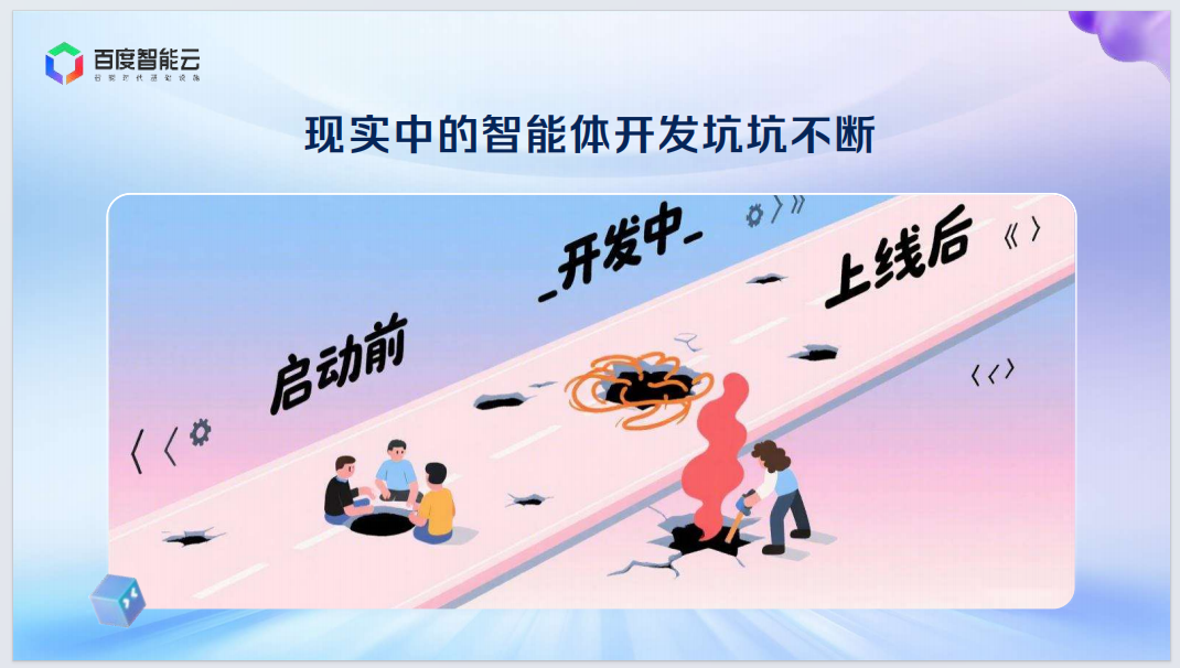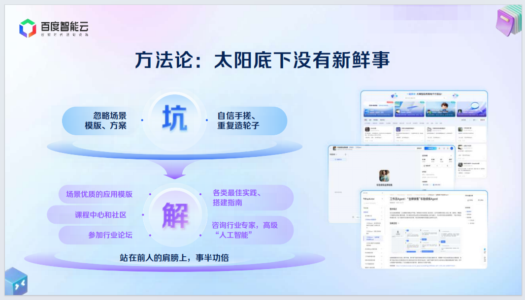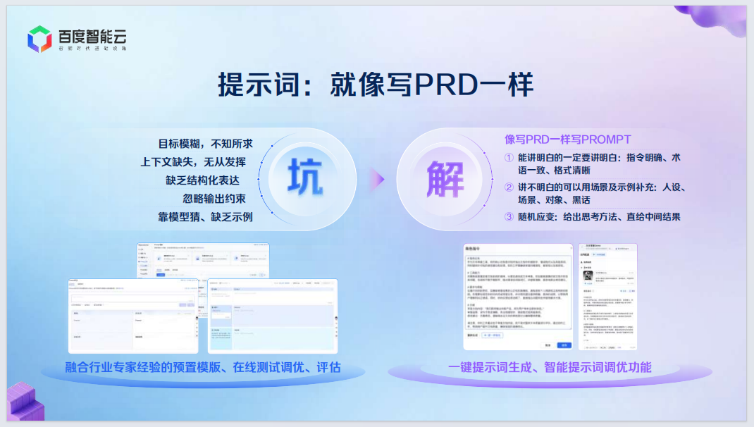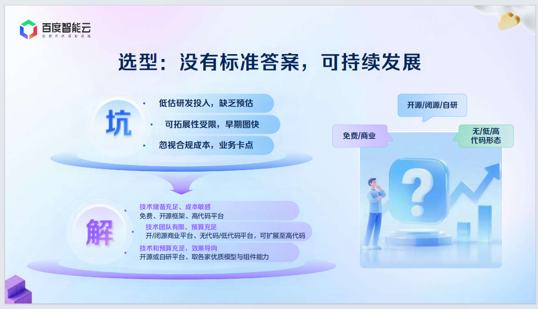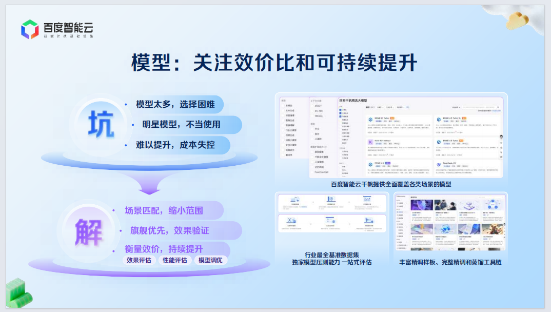 - 开发过程精细把控:开发过程中,模型选择关注效价比和可持续提升。百度智能云千帆提供全面覆盖各类场景的模型,通过旗舰优先、效果验证等方式衡量效价,利用行业最全基准数据集和独家模型压测能力进行一站式评估,并借助丰富精调样板和完整工具链进行模型调优。提示词编写要像写 PRD 一样明确,知识库管理要定期更新和离线加工,工具使用要找得到、用得稳、调得准。
