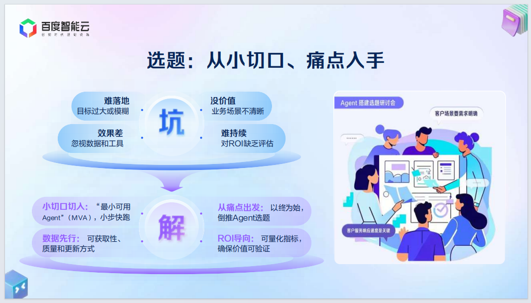- 启动阶段精准规划:在智能体开发启动前,强调选题要从小切口、痛点入手,明确业务场景和目标,以 ROI 为导向设定可量化指标。同时重视数据,确保数据可获取、质量高且更新及时。在选型方面,根据技术团队和预算情况,合理选择开源、闭源或自研平台,避免低估研发投入和忽视合规成本,为后续开发奠定良好基础。