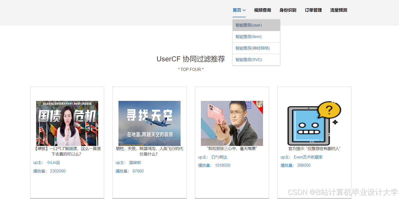 - ItemCF:使用Jaccard相似度推荐与用户历史观看视频相似的内容。