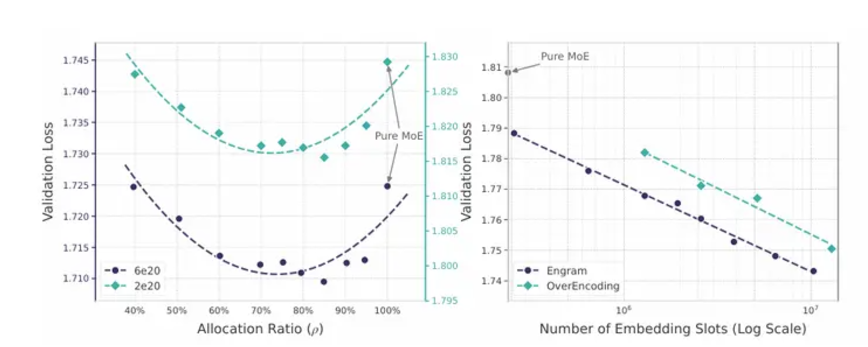 这项研究并不仅停留在理论层面,DeepSeek 在论文中披露了名为“稀疏性分配”(Sparsity Allocation)的关键发现,揭示了模型性能背后的数学规律。研究人员在严格控制总参数量和计算量(FLOPs)不变的前提下,系统性地调整了分配给 MoE 专家与 Engram 记忆表的参数比例。