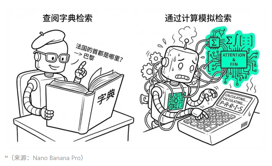 在现有的架构中,模型记忆知识的方式是隐式的。当模型需要回答“法国的首都是哪里”时,它无法像人类查阅字典那样直接检索出“巴黎”这个词,而是需要通过多层注意力机制(Attention)和前馈神经网络(FFN)进行复杂的矩阵运算,实际上是在通过计算来模拟检索过程。
