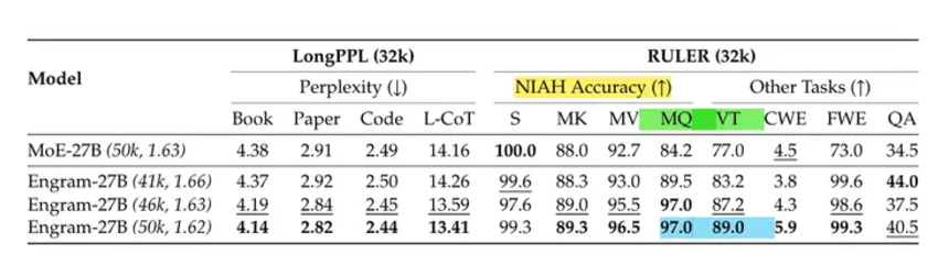 在极具挑战性的“大海捞针”(Needle In A Haystack)测试中,Engram-27B 在该测试中的表现显著优于基准模型。。在多查询(Multi-Query)设置下,其准确率从基准 MoE 模型的 84.2% 飙升至 97.0%;在变量跟踪(Variable Tracking)任务中,准确率从 77.0% 提升至 89.0%。这意味着,搭载 Engram 的模型在处理法律合同分析、长篇小说理解或大型代码库维护等需要极高精度的长文本任务时,将具备更强的鲁棒性。
