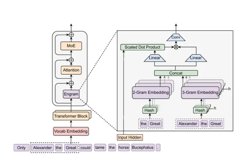 针对这一点,DeepSeek 提出了“条件记忆”的概念,并设计了实体模块 Engram 来加以实现。Engram 的设计灵感源自自然语言处理(NLP)领域经典的 N-gram(N 元语法)模型,但在深度学习语境下进行了现代化改造。传统的 N-gram 依靠统计词汇共现频率来预测下一个词,而 Engram 则将其转化为一种可学习的、基于哈希(Hash)的向量检索系统。