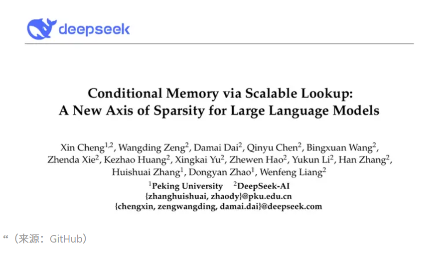 DeepSeek 在 GitHub 上发布了一项代号为“Engram”的最新研究成果,并同步上传了题为Conditional Memory via Scalable Lookup: A New Axis of Sparsity for Large Language Models(基于可扩展查找的条件记忆:大语言模型稀疏性的新维度)的学术论文。