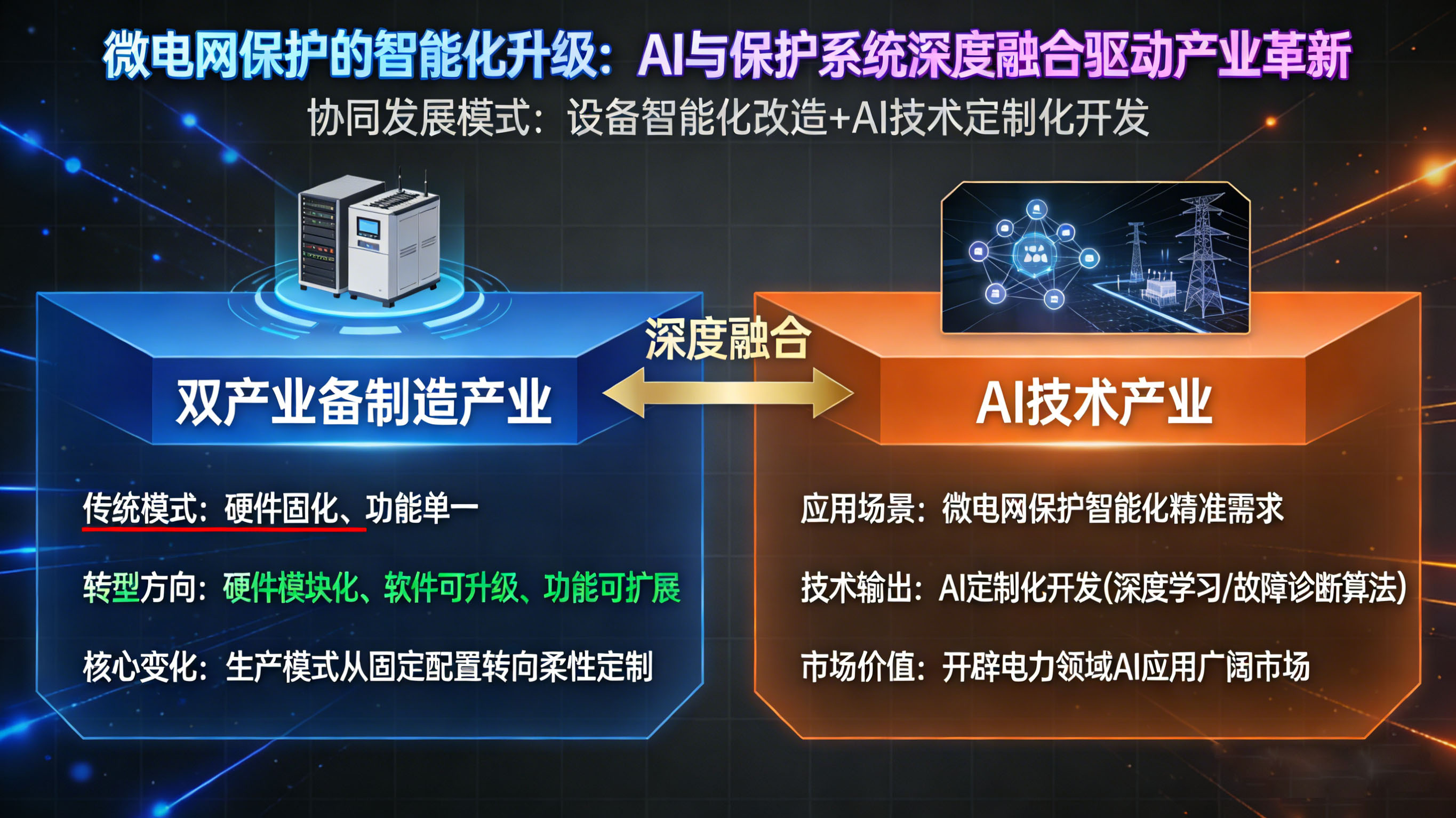 微电网保护的智能化升级,核心是AI技术与保护系统的深度融合,这一趋势直接推动了核心保护设备制造产业的技术革新,并为AI技术在电力领域的应用开辟了广阔市场,形成“设备智能化改造+AI技术定制化开发”的协同发展模式。
