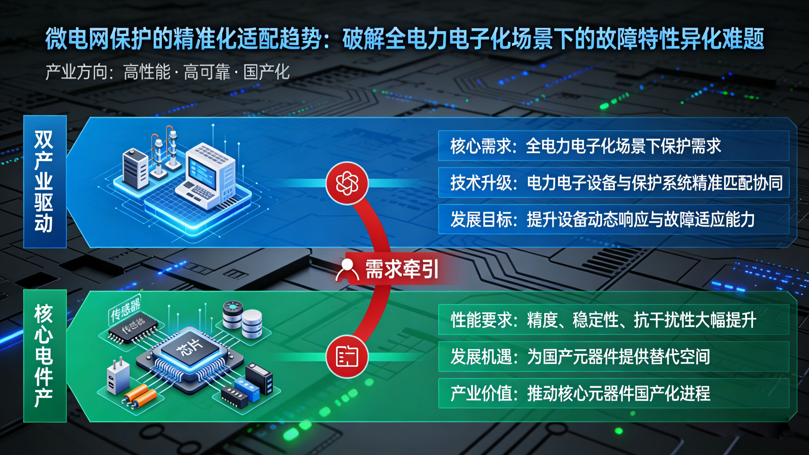 微电网保护的精准化适配趋势,核心是破解全电力电子化场景下的故障特性异化难题,这一需求直接牵引电力电子产业的技术升级,同时为核心元器件的国产化替代提供了重要机遇,推动产业向“高性能、高可靠、国产化”方向发展。
