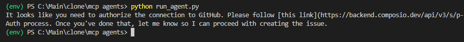 当你运行 run_agent.py,系统将尝试建立到 GitHub 工具的连接。第一次使用时,你需要在浏览器中打开 OAuth 链接进行授权。