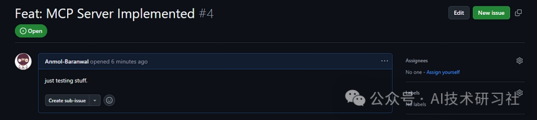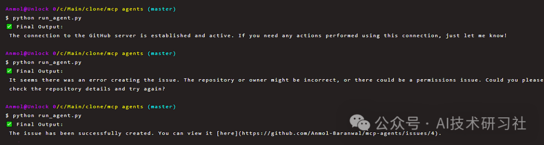 验证连接成功后,可再次运行脚本,代理就能真正创建 GitHub issue。请确保目标仓库为公开状态,否则可能由于权限不足导致操作失败。