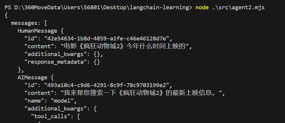 第一个是 HumanMessage,用户的提问,然后第二个是 AI 分析后的结果,需要调用 tool,然后是 tool 返回的结果,然后 AI 再根据用户提问和 tool 返回的结果,整合后返回最终的结果。