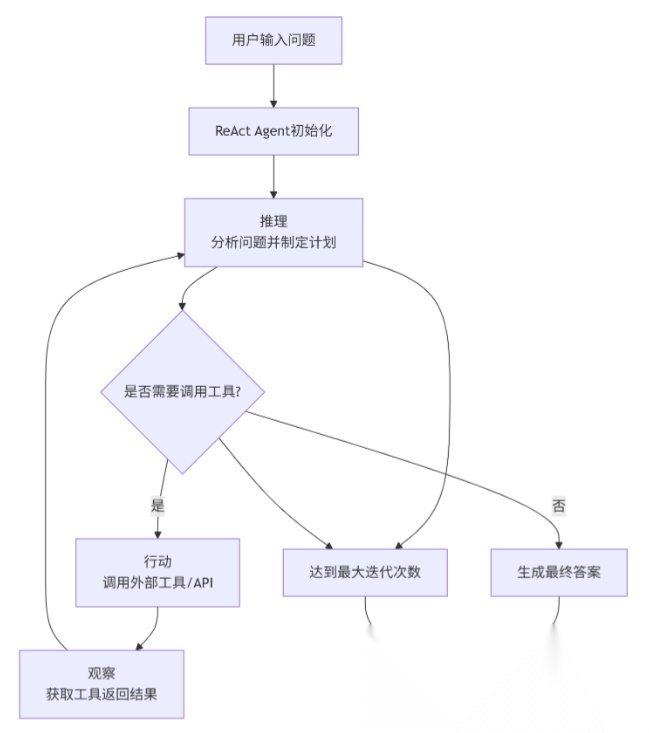 ReAct Agent 的工作流程是一个典型的 “推理-行动-观察”循环,其核心在于让大模型能够通过多轮工具调用来解决复杂问题。