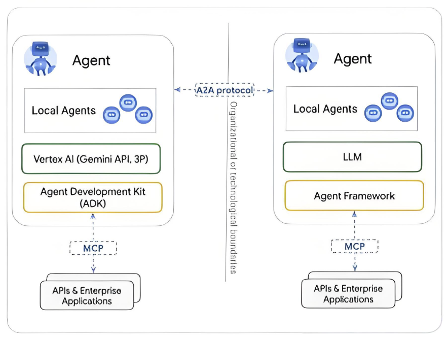 A2A 直译是“智能体到智能体协议”,简单说就是智能体之间的“通用语言”——不同框架、不同厂商开发的智能体,只要遵循 A2A 协议,就能互相“沟通”,不用再担心“鸡同鸭讲”。如果说 MCP 解决了“智能体与工具”的协作问题,A2A 就解决了“智能体与智能体”的协作问题。