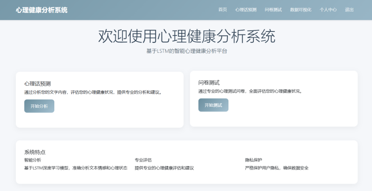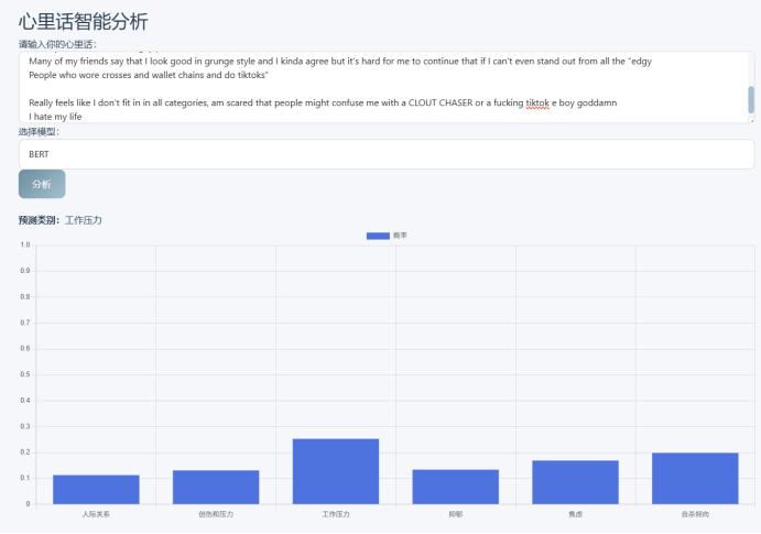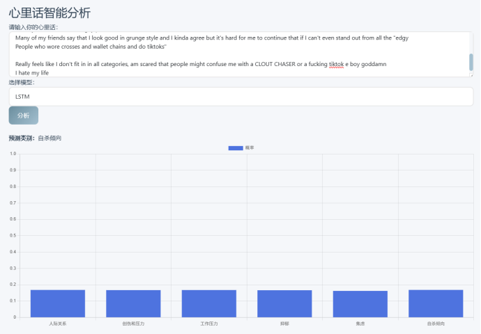 本项目实现了一个从数据到模型、从前端到后端的完整心理健康分析系统,具备较强的实用性和可扩展性。通过LSTM与BERT的融合,系统不仅具备高准确率,还保留了较好的可解释性。我们希望通过开源该项目,推动AI在心理健康领域的合规、可信、有温度的应用。