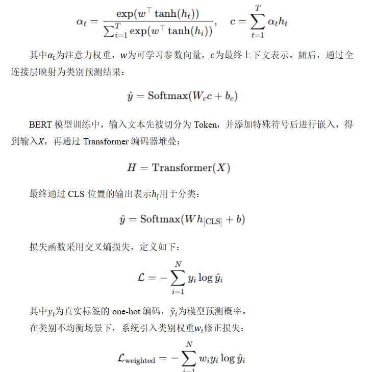 我们构建了一个双向LSTM+注意力机制的文本分类模型,用于捕捉文本中的时序依赖和关键情感词。