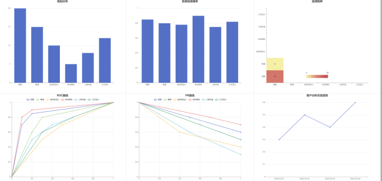 我们使用ECharts绘制了六类心理问题的概率分布柱状图、混淆矩阵热力图、ROC/PR曲线等,帮助用户直观理解模型判断依据。