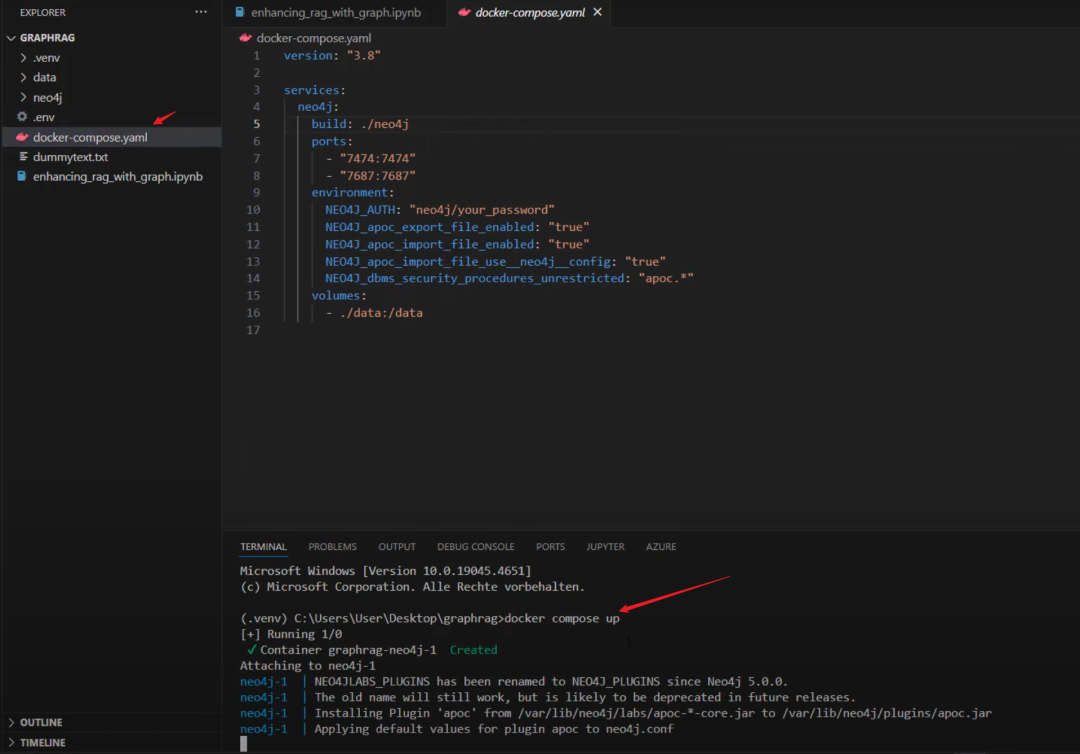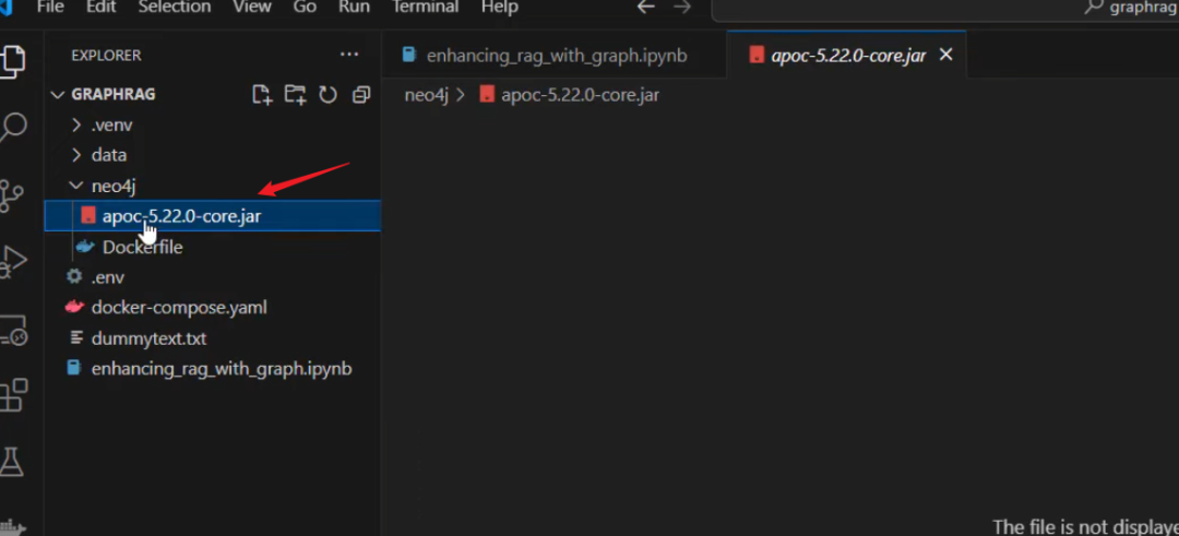 在进入代码之前,我们将设置 Neo4j。我为你创建了一个 Docker Compose 文件。所以我们将使用 neo4j 文件夹,里面有一个 jar 文件,这是我们创建图所需的插件。