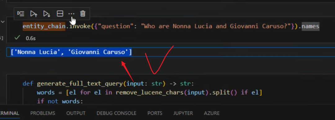 我们得到了我们的实体链,并可以像这样调用它。我们传入问题 “Who are Nonna and Giovanni Corrado?”,所以我们有两个名字,执行调用方法后,我们可以看到输出是一个字符串列表,只有名字,