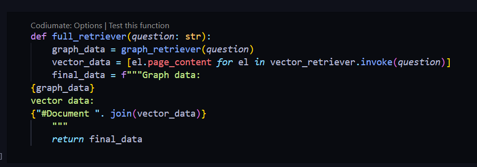 然后我们创建一个混合检索器,使用 graph_retriever 和我们的向量存储检索器。我们定义一个函数 full_retriever,在这里设置我们的 graph_retriever 函数,并使用向量检索器,调用其 invoke 方法,获取最相关的文档。我们有了关系图和基于余弦相似度的最相关文档,最终我们将所有文档结合,返回最终数据集。这就是 full_retriever 的作用。