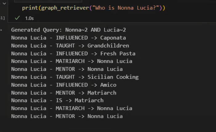 现在我们可以问 “Who is Nonna Lucia? Did she teach anyone about restaurants or cooking?” 所有关于关系的东西,执行结果: