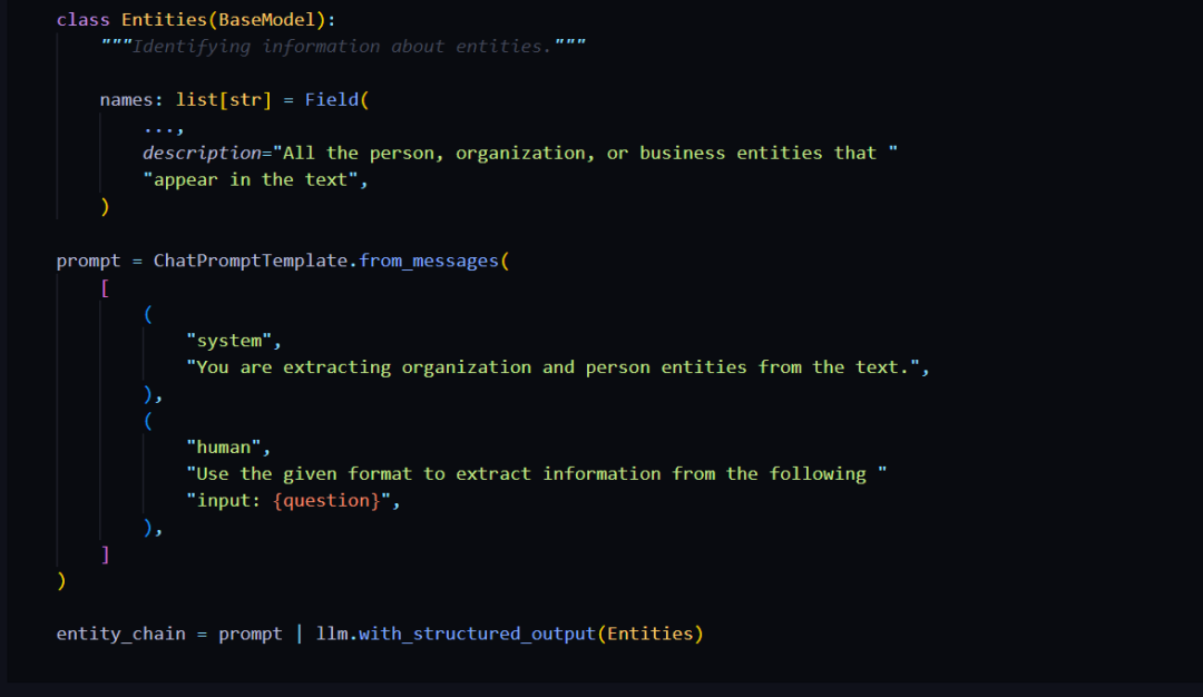 然后我们创建一个 ChatPromptTemplate,系统消息是你正在从文本中提取组织、个人和业务实体。然后我们提供用户输入,并将我们的提示模板传递给 LLM,与结构化输出一起使用,这使用了 Entities 类。我将向你展示其效果。