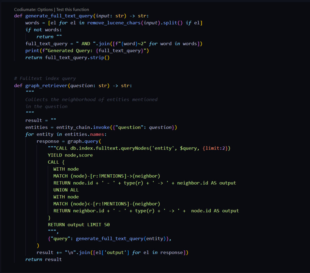 这些名字将用于查询图数据库。接下来是在 graph_retriever 函数中调用这个方法。首先从查询中提取实体,然后对 Neo4j 运行查询,我将向你展示最终效果。