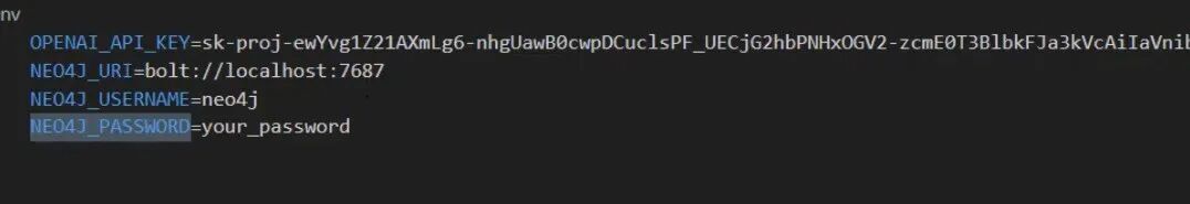我们还将使用 dotenv 包,并在 Jupyter Notebook 中加载环境变量。在 .env 文件中,有一个 OpenAI API 密钥、一个 Neo4j URI、Neo4j 用户名和密码。你可以按原样使用这些信息,但在仓库中,它们将被命名为 .env.example。