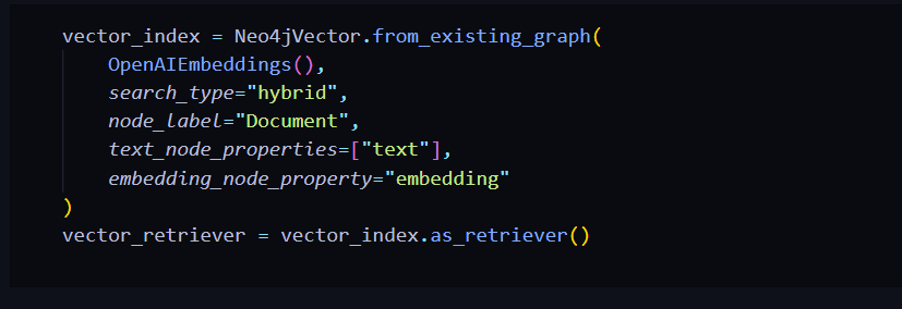 下一步是从 Neo4j 创建一个向量存储,所以我们将使用 Neo4jVector 类,并使用 from_existing_graph 方法,在这里我们只传入嵌入模型,从现有图中计算嵌入。这样我们也可以执行向量搜索,最终我们将把这个向量索引转换成一个检索器,以便有一个标准化的接口。