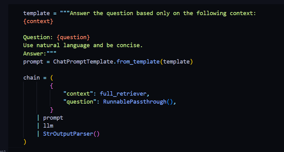 我们只使用一个字符串输入,传递给 full_retriever 函数,保持问题不变,然后将 context 和 question 传递给我们的提示,以填充这些变量。填充这些变量后,我们将所有内容传递给 LLM,并将 LLM 的输出传递给字符串输出解析器。