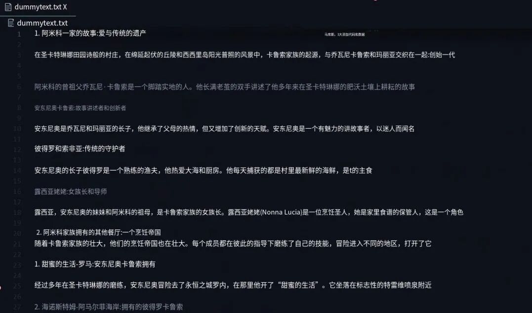 你可以看到它描述了这个意大利家庭的大量信息,包括不同的名字、关系,如 Antonio 的妹妹 Amo、祖母等。这些信息稍后都将在我们的图中呈现。