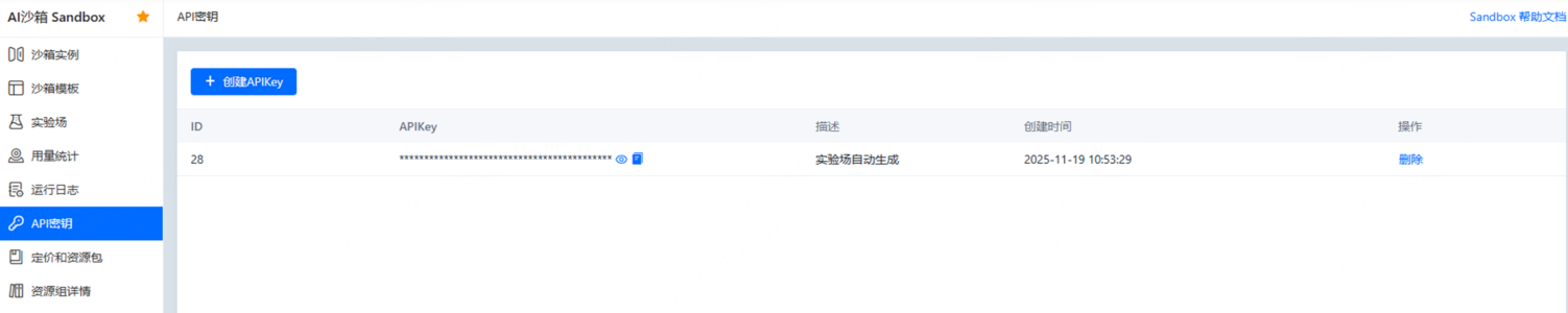 API密钥是创建和管理沙箱的身份凭证,用于认证和权限控制。您可以创建自己的APIKEY完成沙箱的增删改查操作。