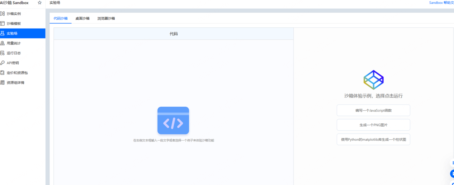 试验场:试验场提供沙箱试用功能,包括代码沙箱、桌面沙箱、浏览器沙箱。您可通过试验场可快速体验沙箱功能。
