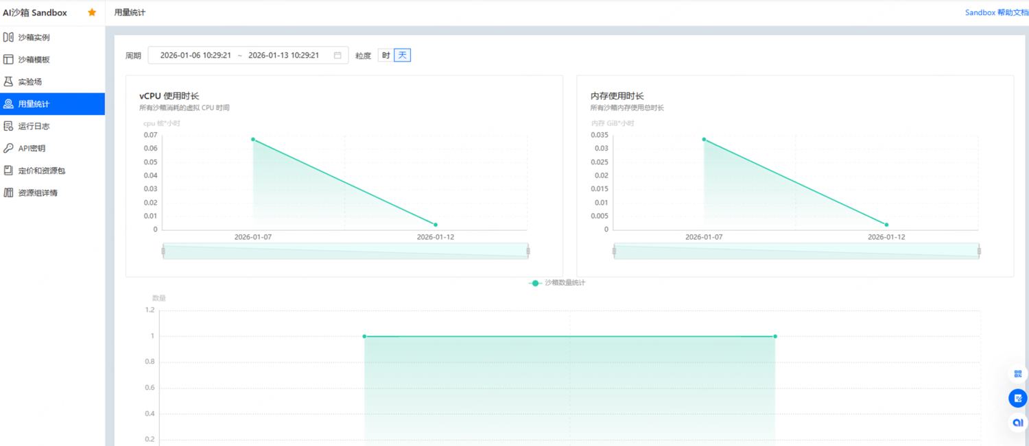 用量统计:可查看沙箱的总数量,以及沙箱使用的CPU、内存量,可根据时间进行筛选