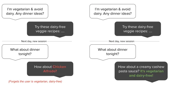 上图中(来源于Mem0[1]),左边是没有Memory的agent,右边是有Memory的agent,后者可以根据上图(来源:Mem0 [1])直观对比了有无记忆能力的 Agent 差异:左侧无记忆的 Agent 无法感知用户的素食 + 忌乳制品偏好,给出的回复脱离需求;而右侧具备记忆的 Agent 能结合过往交互信息,精准输出符合用户需求的无乳制品素食菜单。