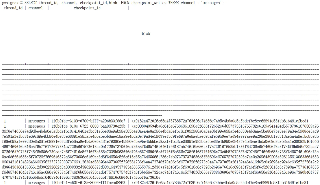 from langchain.chat_models import init_chat_modelfrom langgraph.graph import StateGraph, MessagesState, STARTfrom langgraph.checkpoint.postgres import PostgresSaverBASE_URL=""TOKEN=""MODEL_NAME=""model = init_chat_model( model=MODEL_NAME, model_provider="openai", base_url=BASE_URL, api_key=TOKEN, temperature=0,)DB_URI = "postgresql://postgres:postgres@localhost:5432/postgres?sslmode=disable"with PostgresSaver.from_conn_string(DB_URI) as checkpointer: checkpointer.setup() # 第一次调用时必须要setup() def call_model(state: MessagesState): response = model.invoke(state["messages"]) return {"messages": response} builder = StateGraph(MessagesState) builder.add_node(call_model) builder.add_edge(START, "call_model") graph = builder.compile(checkpointer=checkpointer) config = { "configurable": {"thread_id": "1" } } response = graph.invoke( {"messages": [{"role": "user", "content": "你好,我叫ada!"}]}, config ) print(response['messages'][-1].content) response = graph.invoke( {"messages": [{"role": "user", "content": "你好,请问你还记得我叫什么名字么?"}]}, config ) print(response['messages'][-1].content)