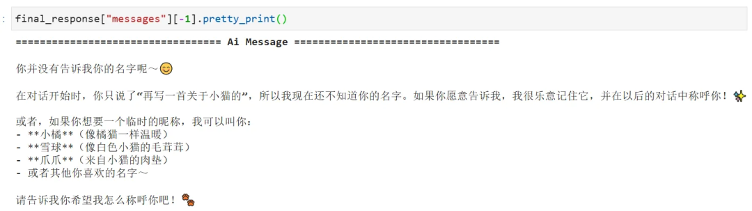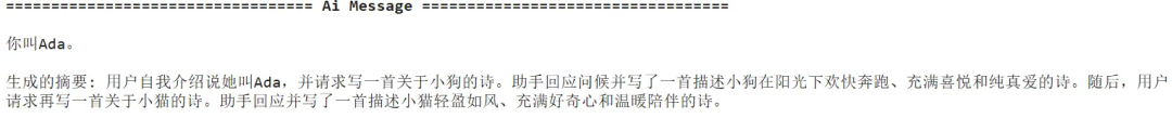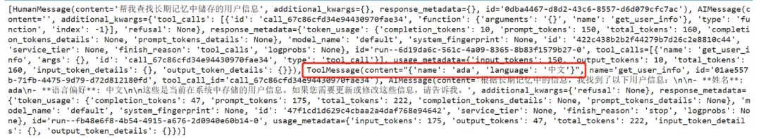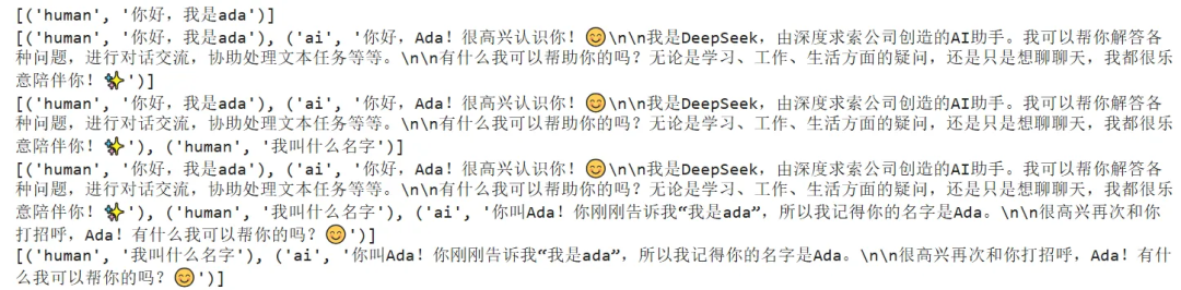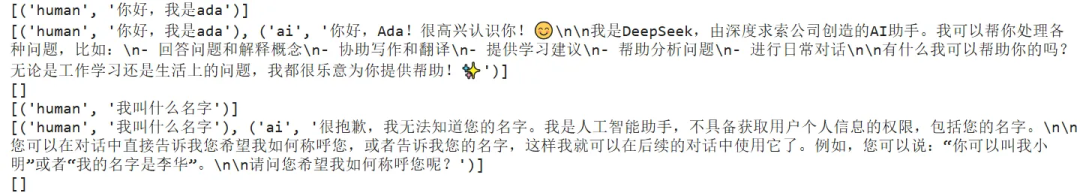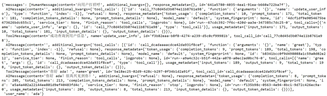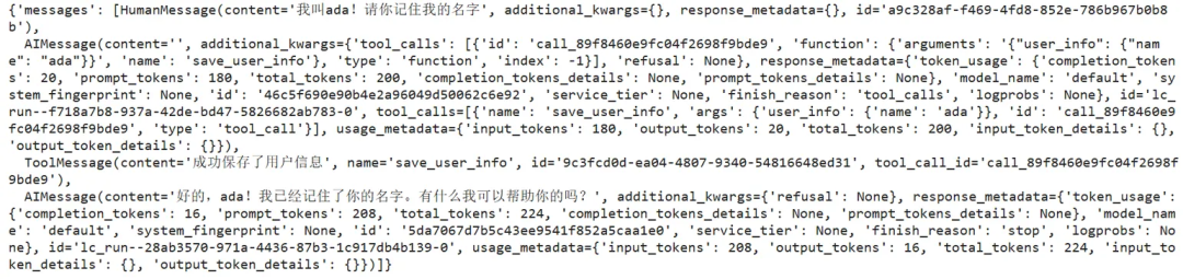 config = {"configurable": {"thread_id": "1"}} # 激活记忆机制的核心。如果没有提供thread_id,每次invoke调用都将是无状态的,只要使用相同的thread_id,LangGraph就会在多次调用之间维持对话状态response = agent.invoke( {"messages": [{"role": "user", "content": "你好,我叫ada!"}]}, config)print(f"thread1_bot_answer:{response['messages'][-1].content}")response = agent.invoke( {"messages": [{"role": "user", "content": "你好,请问你还记得我叫什么名字么?"}]}, config)print('------------线程1------------------')print(f"thread1_bot_answer:{response['messages'][-1].content}")new_config = {"configurable": {"thread_id": "2"}}response = agent.invoke( {"messages": [{"role": "user", "content": "你好,请问你还记得我叫什么名字么?"}]}, new_config)print('------------线程2------------------')print(f"thread2_bot_answer:{response['messages'][-1].content}")